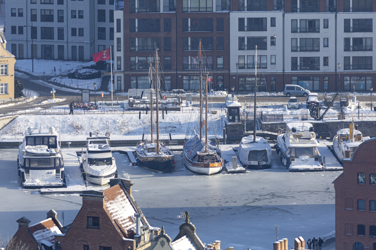 Gdańsk. Zimowa panorama miasta sfotografowana ze szczyty wieży Bazyliki Mariackiej. W dniu, w którym wykonano zdjęcia temperatura powietrza wynosiła -9 stopni Celsjusza.