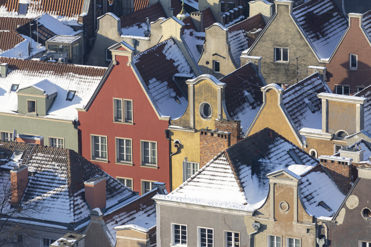 Gdańsk. Zimowa panorama miasta sfotografowana ze szczyty wieży Bazyliki Mariackiej. W dniu, w którym wykonano zdjęcia temperatura powietrza wynosiła -9 stopni Celsjusza.