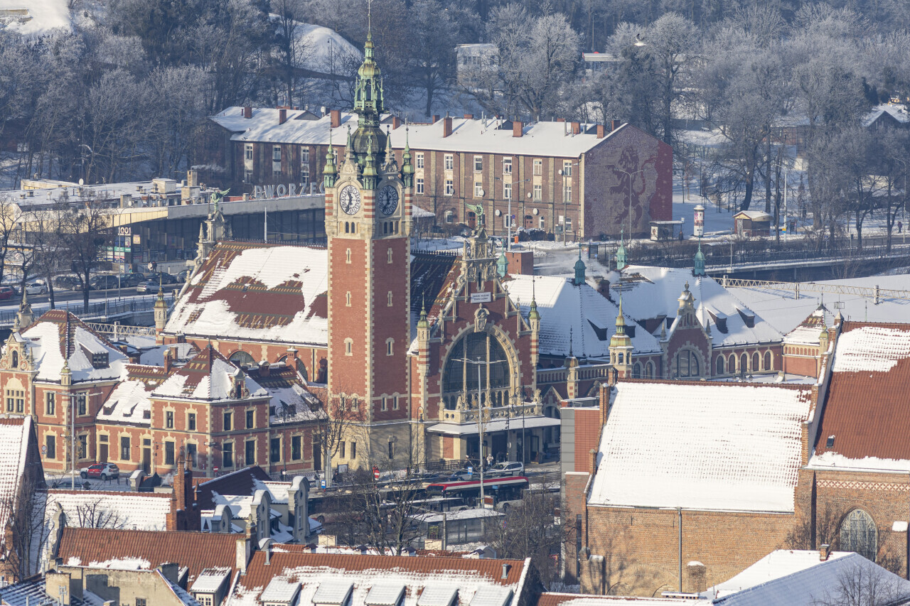 Gdańsk. Zimowa panorama miasta sfotografowana ze szczyty wieży Bazyliki Mariackiej. W dniu, w którym wykonano zdjęcia temperatura powietrza wynosiła -9 stopni Celsjusza. Nz. Dworzec Główny PKP