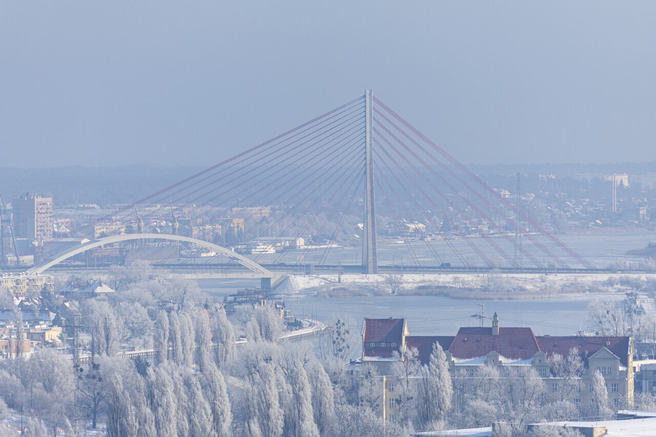 Gdańsk. Zimowa panorama miasta sfotografowana ze szczyty wieży Bazyliki Mariackiej. W dniu, w którym wykonano zdjęcia temperatura powietrza wynosiła -9 stopni Celsjusza.