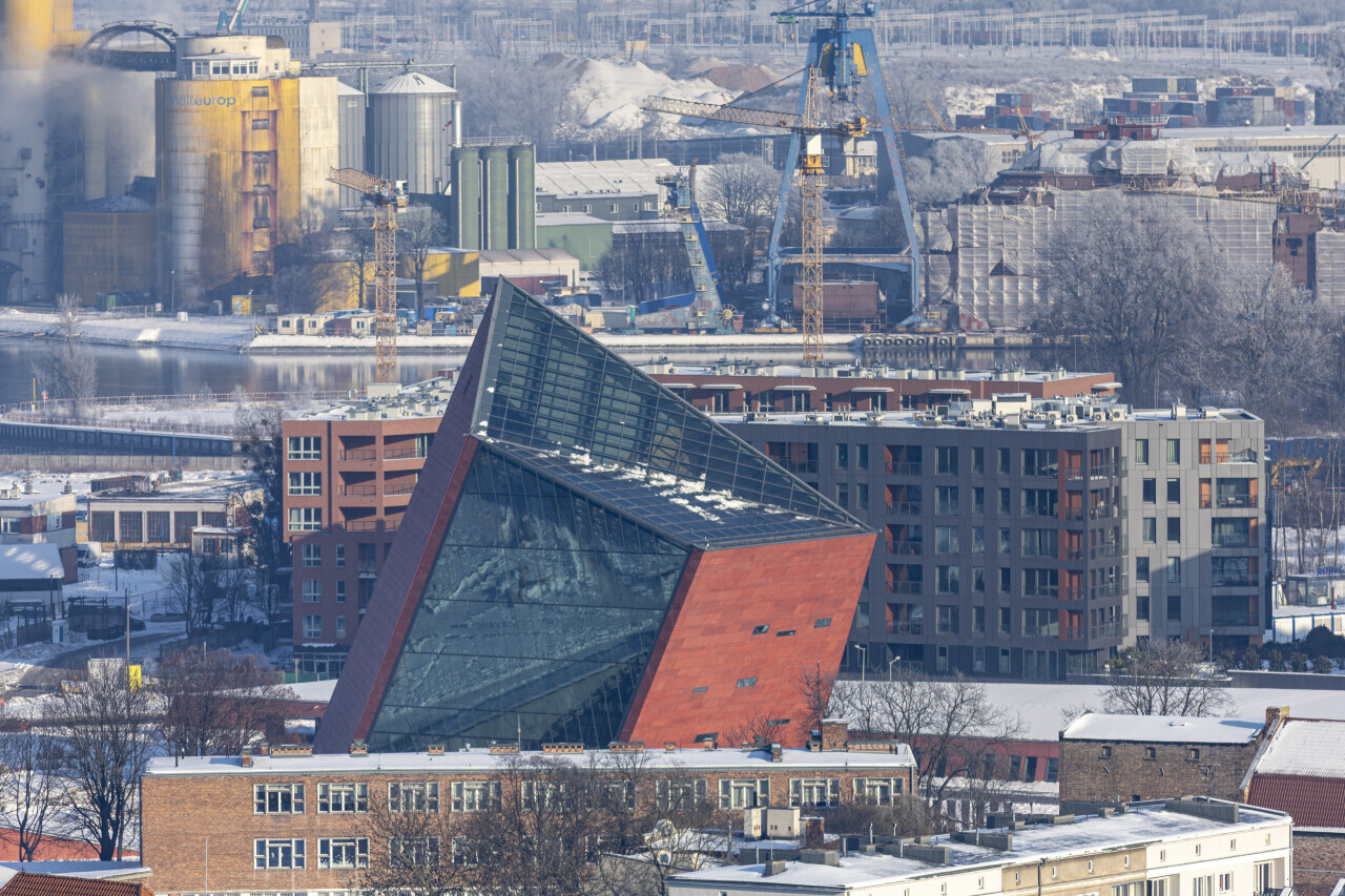 Gdańsk. Zimowa panorama miasta sfotografowana ze szczyty wieży Bazyliki Mariackiej. W dniu, w którym wykonano zdjęcia temperatura powietrza wynosiła -9 stopni Celsjusza. Nz. Muzeum II Wojny Światowej