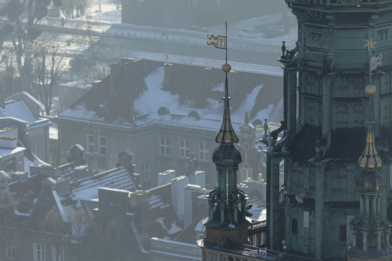 Gdańsk. Zimowa panorama miasta sfotografowana ze szczyty wieży Bazyliki Mariackiej. W dniu, w którym wykonano zdjęcia temperatura powietrza wynosiła -9 stopni Celsjusza.