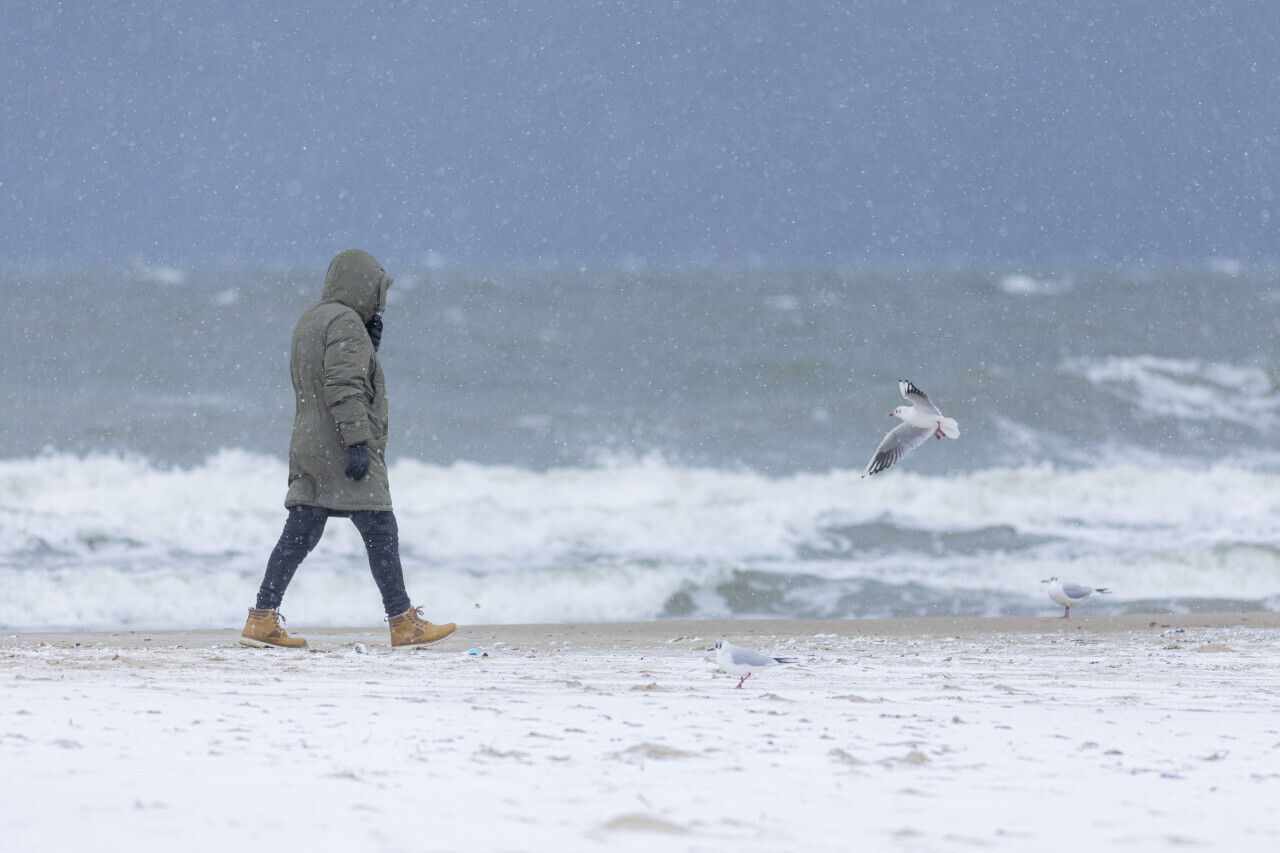 Gdańsk. Zimowe zdjęcia molo w Brzeźnie i pobliskiej plaży. Niska temperatura i silny wiatr nie zniechęcił spacerowiczów do wizyty nad morzem.