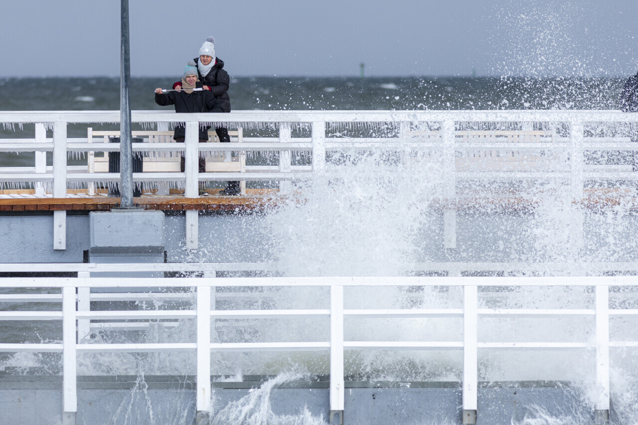 Gdańsk. Zimowe zdjęcia molo w Brzeźnie i pobliskiej plaży. Niska temperatura i silny wiatr nie zniechęcił spacerowiczów do wizyty nad morzem.