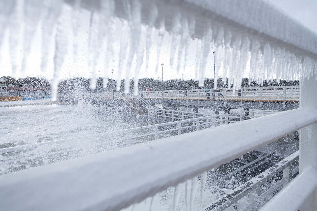 Gdańsk. Zimowe zdjęcia molo w Brzeźnie i pobliskiej plaży. Niska temperatura i silny wiatr nie zniechęcił spacerowiczów do wizyty nad morzem.