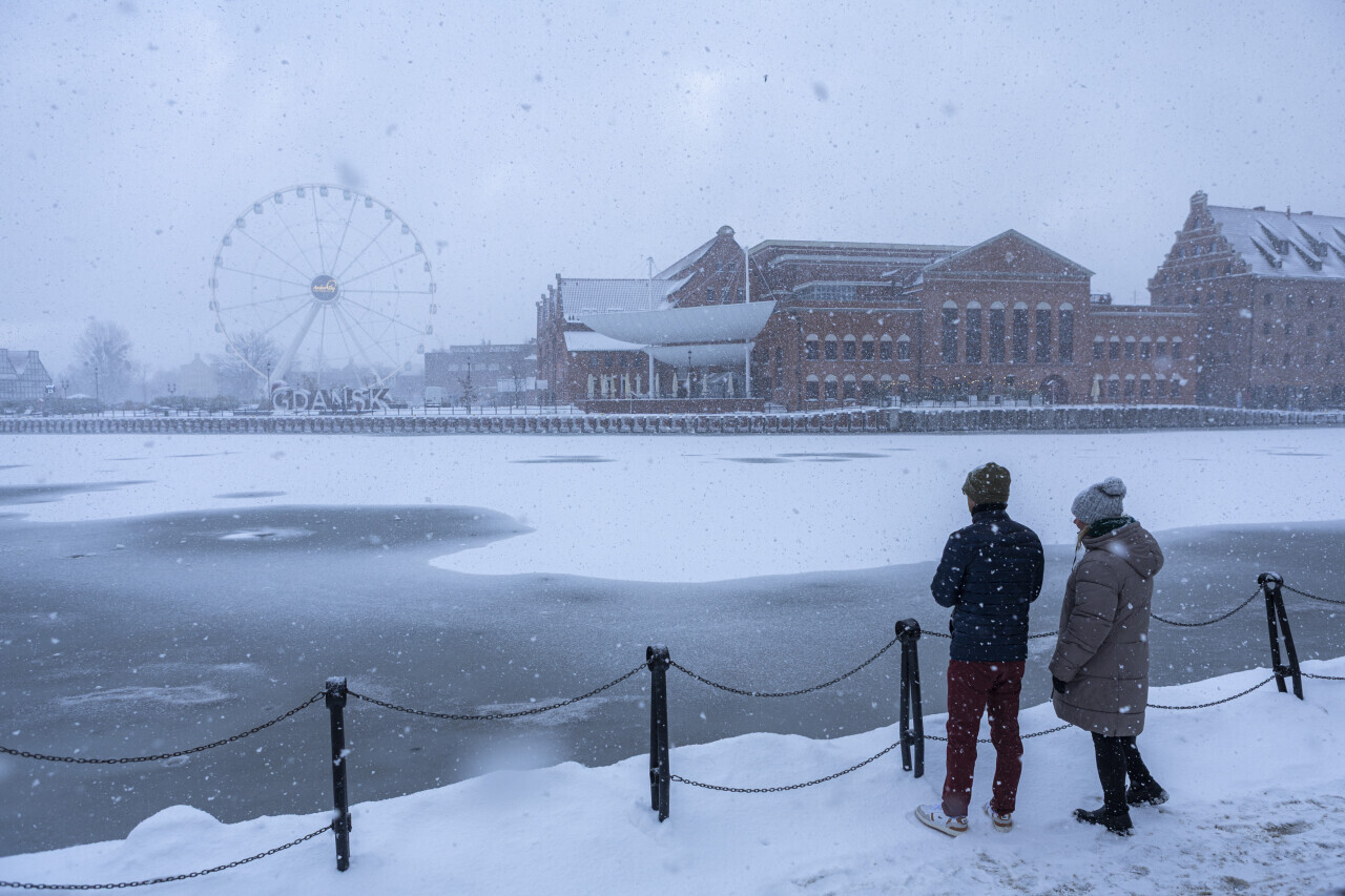 Gdańsk. Do miasta dotarła prawdziwa zimowa pogoda. Śnieg przykrył dachy kamienic, a lód skuł wody Motławy.