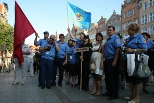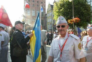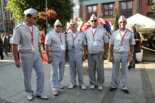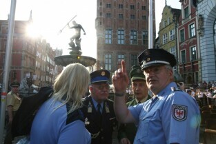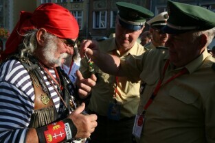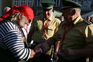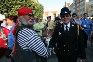 63. Międzynarodowy Motorowy Zlot Gwaździsty Policji. Parada ul. Długą oraz oficjalne rozpoczęcie na Długim Targu. Nz. Gdański Pirat wymienia się pamiątkami z niemieckimi policjantami