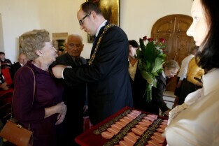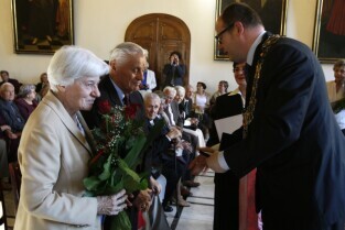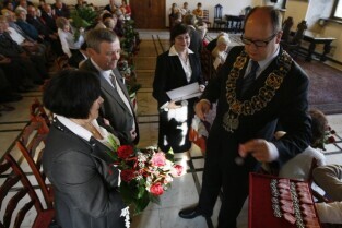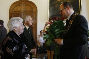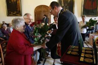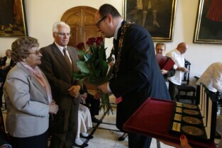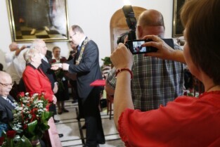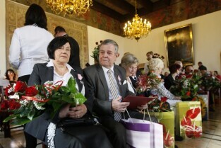 Jubileusz Par Małżeńskich - "Złote Gody", podczas których Prezydent Gdańska Paweł Adamowicz wręczył medale za długoletnie pożycie małżeńskie. Gdańsk, Ratusz Głównomiejski