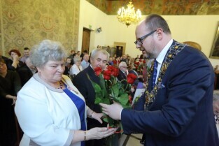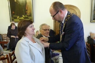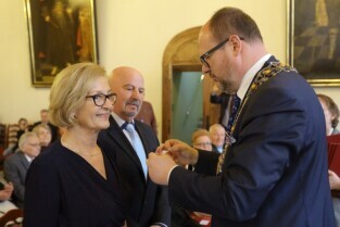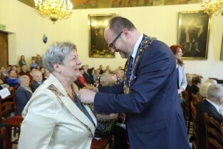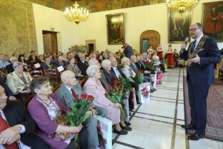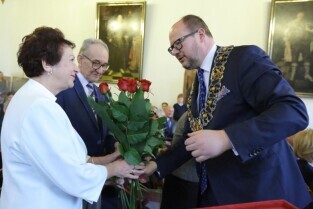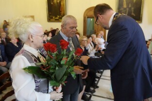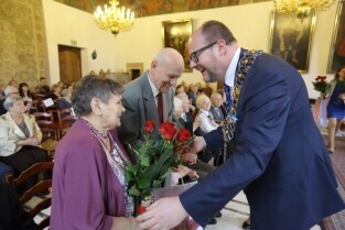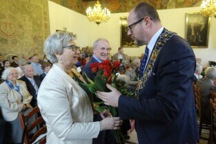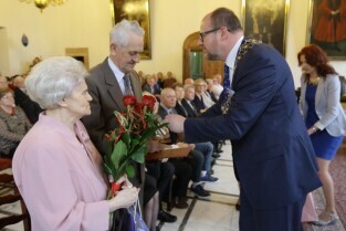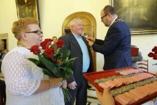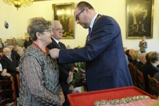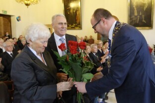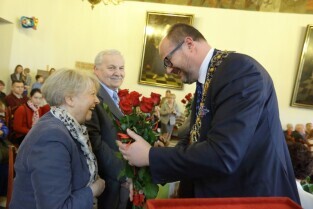 Gdańsk. Gdańsk, Ratusz Głównego Miasta. Jubileusz Par Małżeńskich - "Złote Gody", podczas których Prezydent Gdańska Paweł Adamowicz wręczył medale za długoletnie pożycie małżeńskie. Gdańsk, Ratusz Głównego Miasta. Nz. Irena i Sławomir Kadulscy.