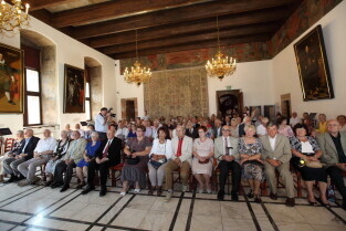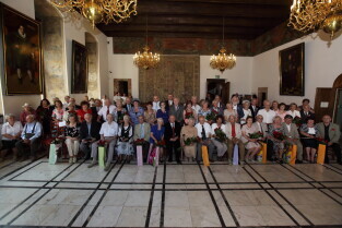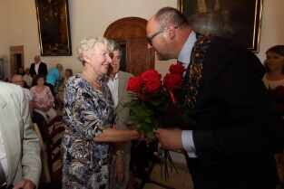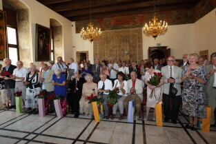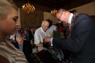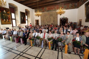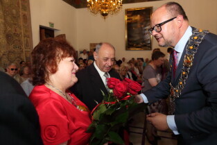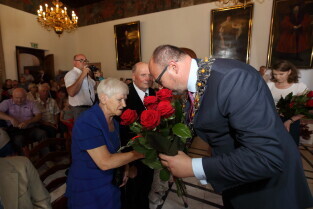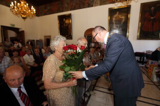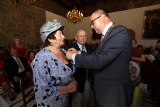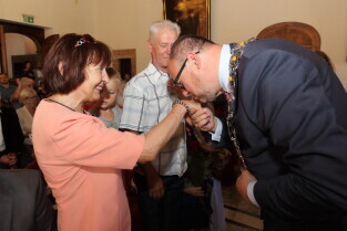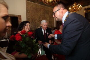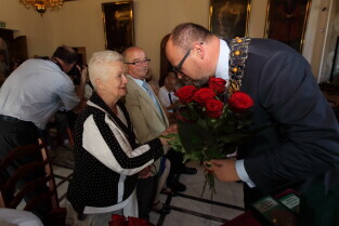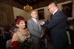 Jubileusz Par Małżeńskich - "Złote Gody". Gdańsk, Ratusz Głównomiejski. Prezydent Gdańska Paweł Adamowicz wręcza medale za 65-, 60- i 50-lecie pożycia małżeńskiego