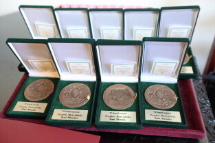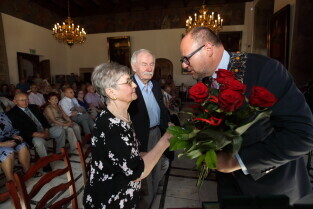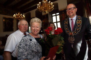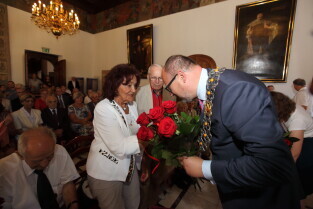 Jubileusz Par Ma³¿eñskich - "Z³ote Gody". Gdañsk, Ratusz G³ównomiejski. Prezydent Gdañska Pawe³ Adamowicz wrêcza medale za 65-, 60- i 50-lecie po¿ycia ma³¿eñskiego