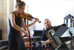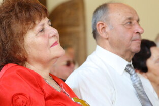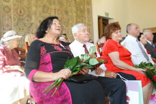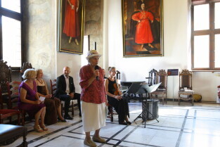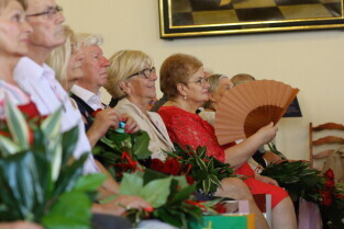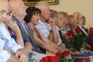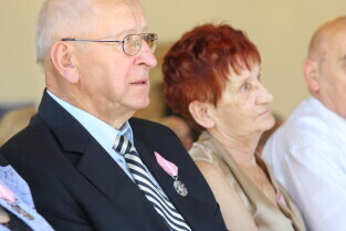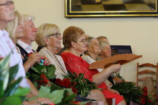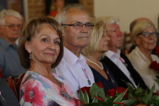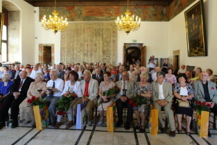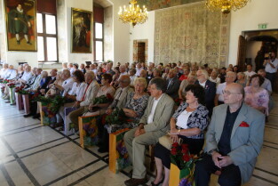 Jubileusz Par Małżeńskich - "Złote Gody". Gdańsk, Ratusz Głównomiejski. Prezydent Gdańska Paweł Adamowicz wręcza medale za 65-, 60- i 50-lecie pożycia małżeńskiego