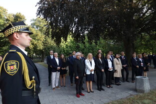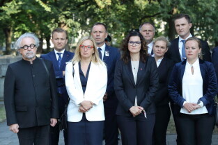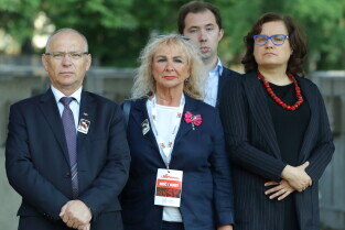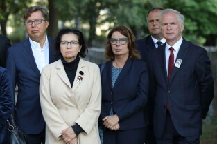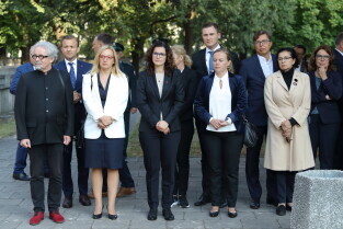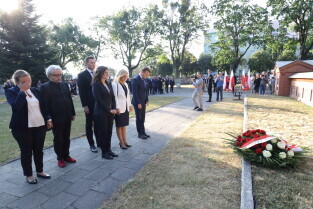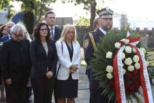 Gdańsk. Złożenie kwiatów na grobowcu Obrońców Poczty Polskiej. Prezydent Gdańska Aleksandra Dulkiewicz, Przewodnicząca Rady Miasta Gdańska Agnieszka Owczarczak, Wiceprezydent Gdańska Piotr Grzelak i Radny Andrzej Stelmasiewicz.