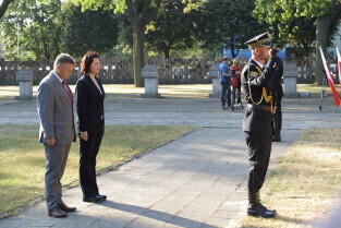 Gdańsk. Złożenie kwiatów na grobowcu Obrońców Poczty Polskiej. Nz. Magdalena Mistat ECS i Waldemar Ossowski Muzeum Gdańska.