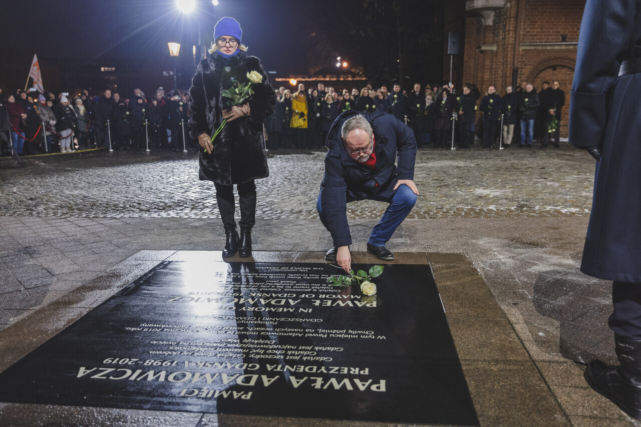 Gdańsk, pamiątkowa tablica. Złożenie kwiatów w 7. rocznicę zamachu na Pawła Adamowicza