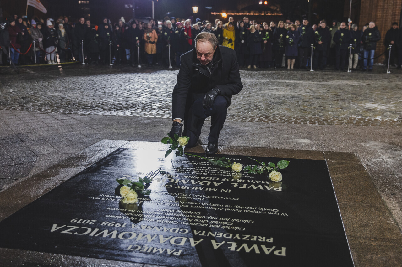 Gdańsk, pamiątkowa tablica. Złożenie kwiatów w 7. rocznicę zamachu na Pawła Adamowicza