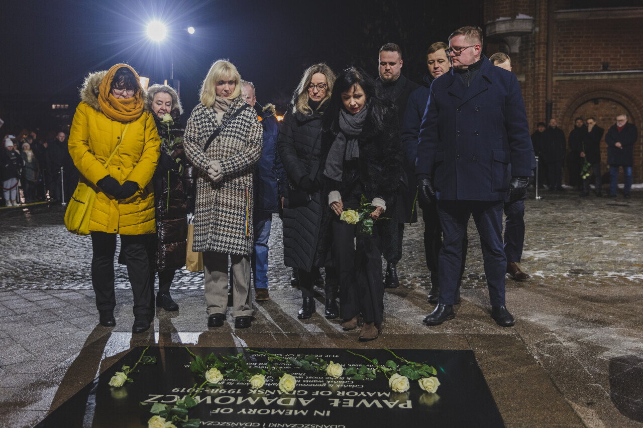 Gdańsk, pamiątkowa tablica. Złożenie kwiatów w 7. rocznicę zamachu na Pawła Adamowicza