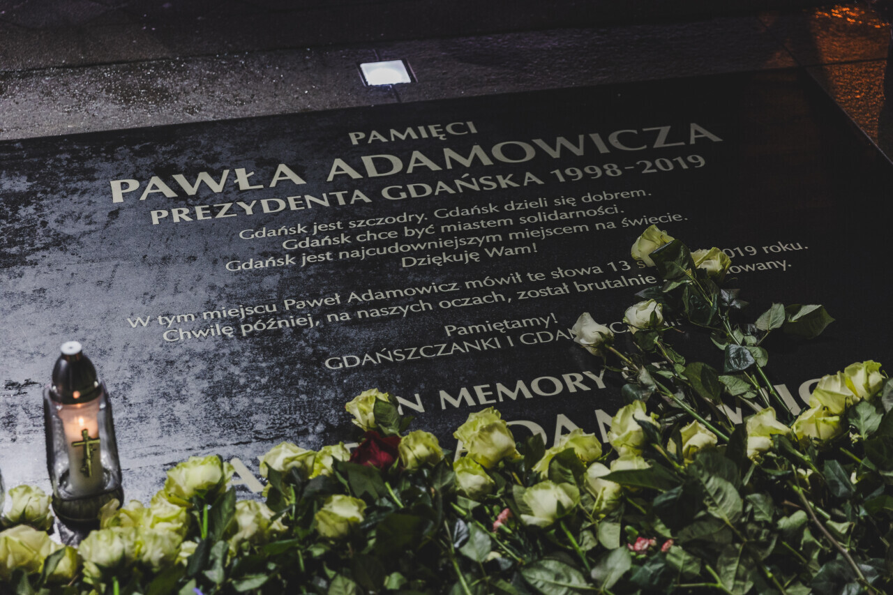 Gdańsk, pamiątkowa tablica. Złożenie kwiatów w 7. rocznicę zamachu na Pawła Adamowicza