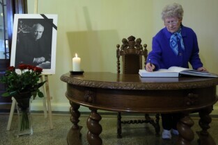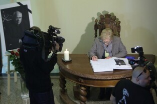 Gdańsk Budynek Rady Miasta. Zmarł Abp Tadeusz Gocłowski - Wpisy do księgi kondolencyjnej. Nz Gdańszczanka Zofia Żukowska.