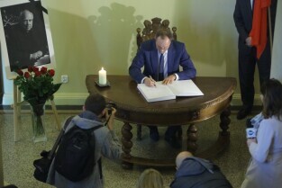 Gdańsk Budynek Rady Miasta. Zmarł Abp Tadeusz Gocłowski - Wpisy do księgi kondolencyjnej. Nz Marszałek Województwa Pomorskiego Mieczysław Struk.
