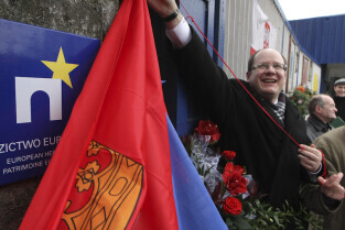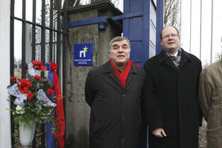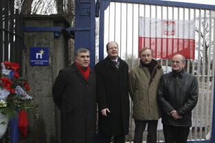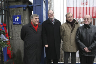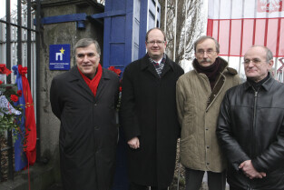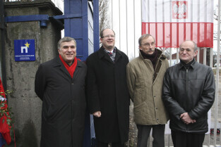 Odsłonięcie Znaku Dziedzictwa Europejskiego, inicjatywy Komisji Europejskiej mającej na celu upamiętnienie miejsc ważnych w tożsamości Europy. Nz. od lewej: o. Maciej Zięba Dyrektor ESC, Paweł Adamowicz Prezydent Gdańska, Marcin Gawlicki Dyrektor Krajowego Ośrodka Badań i Dokumentacji Zabytków, Bogdan Olszewski działacz Solidarnosci