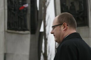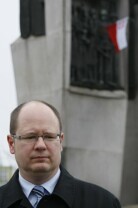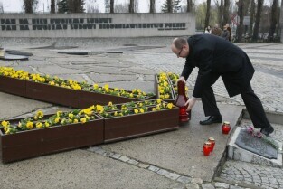 Prezydent Gdańska Paweł Adamowicz zapala znicz pod Pomnikiem Poległych Stoczniowców w dniu katastrofy lotniczej koło Smoleńska (Rosja), w której zgineła m.in. Prezydencka Para RP Lech i Maria Kaczyńscy