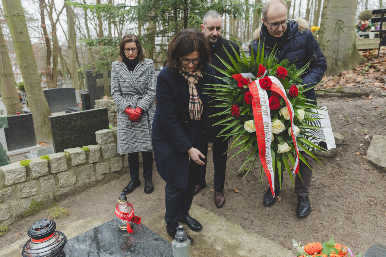 Gdańsk. Prezydent Aleksandra Dulkiewicz z przedstawicielami Europejskiego Centrum Solidarności Magdaleną Mistat i dr Przemysławem Ruchlewskim zapaliła znicze na grobach ofiar Grudnia '70 Józefa Pawłowskiego i Jerzego Matelskiego