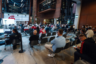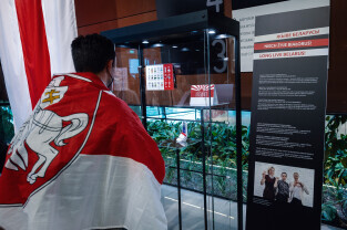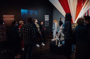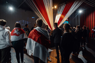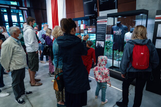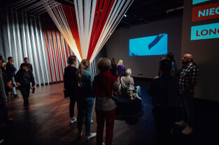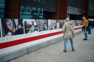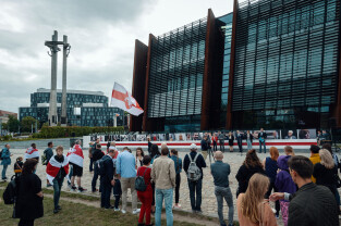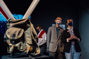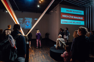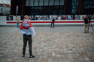 Żywie Biełaruś! Niech Żyje Białoruś! Wernisaż wystawy w pierwszą rocznicę sfałszowanych przez reżim Aleksandra Łukaszenki wyborów prezydenckich na Białorusi. Gdańsk, Europejskie Centrum Solidarności