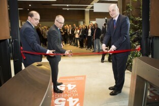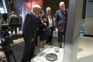 Wystawa czasowa '45. Koniec wojny w 45 eksponatach. Gdańsk, Europejskie Centrum Solidarności. Nz. od lewej: Dyrektor ECS Basil Kerski, Dyrektor Muzeum II Wojny Światowej Paweł Machcewicz, Dyrektor Centrum Polsko-Rosyjskiego Dialogu i Porozumienia Sławomir Dębski