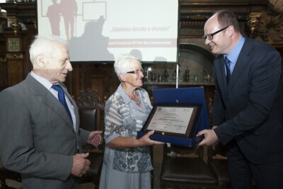 "Gdańska debata o starości" - konferencja poświęcona działaniom na rzecz seniorów oraz sytuacji demograficznej w mieście. Gdańsk, Dwór Artusa. Nz. Prezydent Gdańska Paweł Adamowicz wręcza nagrodę w kategorii "Aktywna Seniorka", którą otrzymuje Barbara Kuryłek, po lewej Prezes Stowarzyszenia "Starsi" Wiesław Siemiński