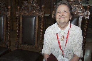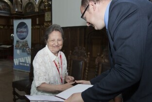 "Gdańska debata o starości" - konferencja poświęcona działaniom na rzecz seniorów oraz sytuacji demograficznej w mieście. Gdańsk, Dwór Artusa. Nz. laureatka wyróżnienia w kategorii "Aktywna Seniorka" Teresa Dobierska