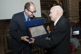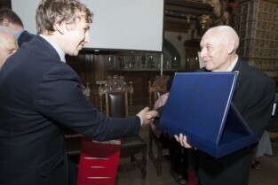"Gdańska debata o starości" - konferencja poświęcona działaniom na rzecz seniorów oraz sytuacji demograficznej w mieście. Gdańsk, Dwór Artusa. Nz. Prezydent Gdańska Paweł Adamowicz wręcza wyróżnienie w kategorii "Aktywny Senior", którą otrzymuje Roman Rakowski