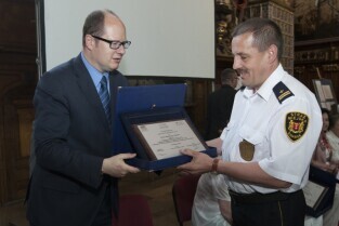 "Gdańska debata o starości" - konferencja poświęcona działaniom na rzecz seniorów oraz sytuacji demograficznej w mieście. Gdańsk, Dwór Artusa. Nz. Prezydent Gdańska Paweł Adamowicz wręcza nagrodę w kategorii "Projekt / inicjatywa", którą otrzymuje Straż Miejska w Gdańsku za projekt "Wiem. Znam. Działam - bezpieczny senior"