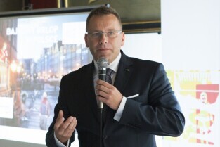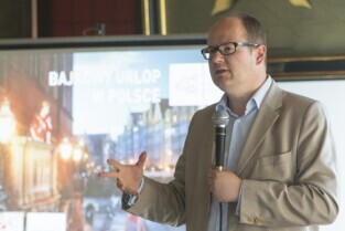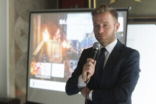 Konferencja prasowa poświęcona kampanii Polskiej Organizacji Turystycznej "Bajowy urlop w Polsce". Gdańsk, Ratusz Głównego Miasta. Nz. Prezes Polskiej Organizacji Turystycznej Rafał Szmytke