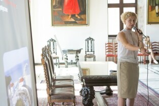 Konferencja prasowa poświęcona kampanii Polskiej Organizacji Turystycznej "Bajowy urlop w Polsce". Gdańsk, Ratusz Głównego Miasta. Nz. Prezes Pomorskiej Regionalnej Organizacji Turystycznej Marta Chełkowska i Członek Zarządu Woj. Pomorskiego Ryszard Świlski