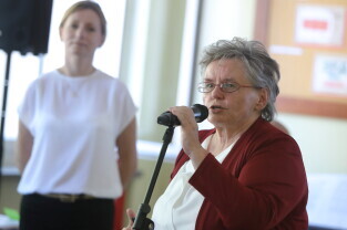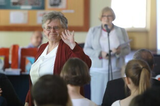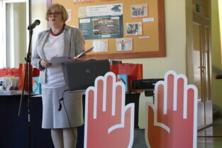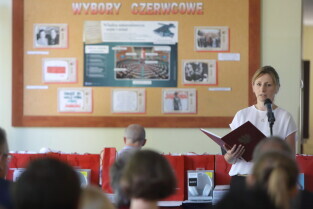 Gdańsk, Szkoła Podstawowa nr 58. Gala podsumowująca konkurs " My w demokracji". Nz. Radna Teresa Wasilewska.