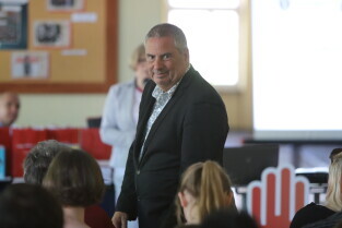 Gdańsk, Szkoła Podstawowa nr 58. Gala podsumowująca konkurs " My w demokracji". Nz. Wiceprezydent Gdańska Piotr Kowalczuk.