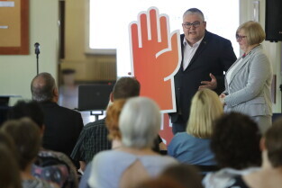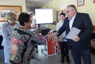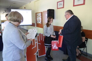Gdańsk, Szkoła Podstawowa nr 58. Gala podsumowująca konkurs " My w demokracji". Nz. Radna Teresa Wasilewska i Wiceprezydent Gdańska Piotr Kowalczuk.