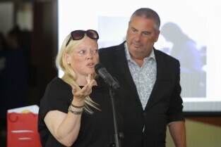 Gdańsk, Szkoła Podstawowa nr 58. Gala podsumowująca konkurs " My w demokracji". Nz. Beata Staszyńska-Hansen i Ono Hansen-Staszyńska.