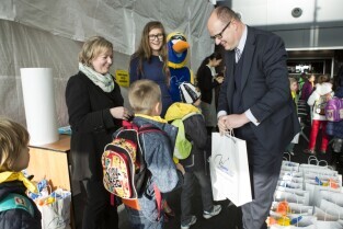 Laureaci konkursu Ryanair "Marzenia uskrzydlają" - uczniowie gdańskich szkół, podczas zwiedzania Portu Lotniczego Gdańsk im. Lecha Wałęsy oraz lotu widokowego na Pomorzem. Nz. Prezydent Gdańska Paweł Adamowicz wręcza nagrody