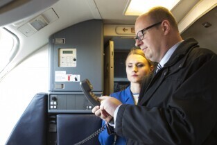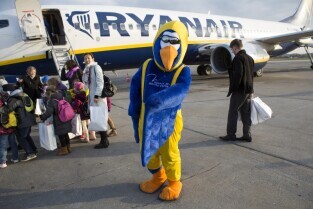 Laureaci konkursu Ryanair "Marzenia uskrzydlają" - uczniowie gdańskich szkół, podczas zwiedzania Portu Lotniczego Gdańsk im. Lecha Wałęsy oraz lotu widokowego na Pomorzem. Nz. Prezydent Gdańska Paweł Adamowicz