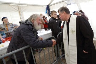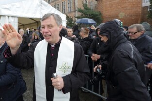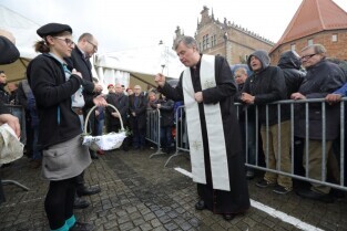 Gdańsk. Święta Wielkanocne. Śniadanie dla potrzebujących na Targu Węglowym. Nz. Ks. Ireneusz Bradtke.