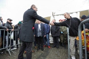 Gdańsk. Święta Wielkanocne. Śniadanie dla potrzebujących na Targu Węglowym. Nz. Prezydent Gdańska Paweł Adamowicz.