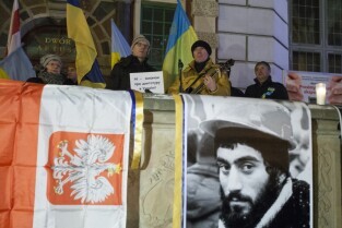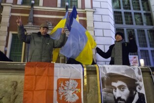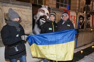 Gdańsk, Długi Targ. "Solidarni z Ukrainą" - wiec poparcia dla demonstrującej opozycji na Ukrainie. Nz. Z-ca Prezydenta Gdańska Maciej Lisicki (drugi od prawej), Radny Miasta Gdańska Marek Bumblis (drugi od lewej), Rzecznik Prezydenta Gdańska Antoni Pawlak (po prawej)