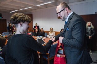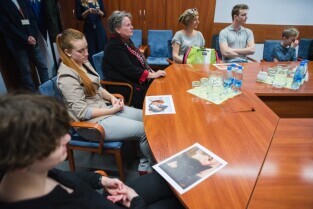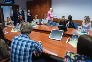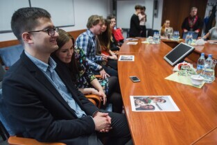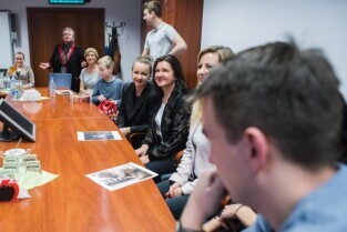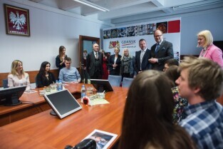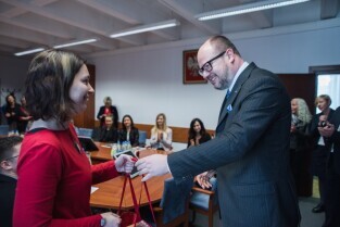 Gdańsk. Urząd Miejski, ul. Nowe Ogrody. „ZaKOTani w Gdańsku” – wręczenie nagród. Nagrody wręczył Prezydent Gdańska, Paweł Adamowicz. Nz nagrodzeni, Magdalena Mazur, Maciej Kurczalski, Monika Ruszewska, Natalia Kajfasz, Katarzyna Lubańska, Marzanna Ziółkowska, Katarzyna Styrna, Tomasz Glapiński, Tomasz Przybyszewski, Martyna Seroczyńska