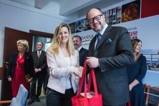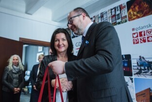 Gdańsk. Urząd Miejski, ul. Nowe Ogrody. „ZaKOTani w Gdańsku” – wręczenie nagród. Nagrody wręczył Prezydent Gdańska, Paweł Adamowicz (Nz) i Natalia Kajfasz