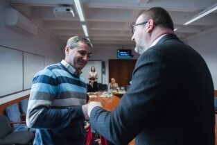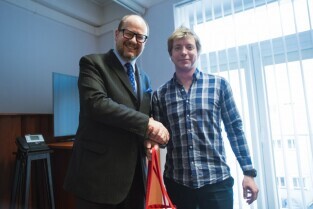 Gdańsk. Urząd Miejski, ul. Nowe Ogrody. „ZaKOTani w Gdańsku” – wręczenie nagród. Nagrody wręczył Prezydent Gdańska, Paweł Adamowicz (Nz) i Maciej Kurczalski