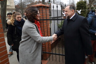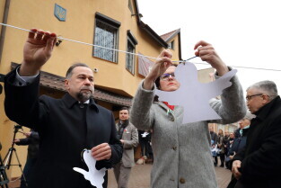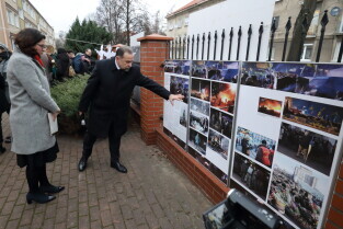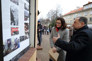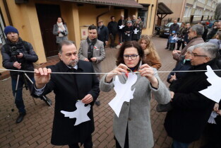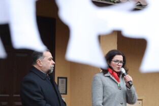 Gdańsk. Piąta rocznica tragicznych wydarzeń na Majdanie. Na terenie Konsulatu w Gdańsku, odbyła się akcja „Anioły Pamięci” ku czci bohaterów „Niebiańskiej Setki” którzy zostali zabici. Nz. Konsul generalny Ukrainy w Gdańsku Lew Zacharczyszyn i Pełniąca obowiązki Prezydenta Gdańska Aleksandra Dulkiewicz.