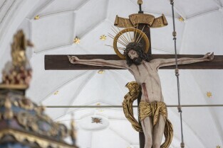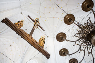 Gdańsk. Wnętrza Bazyliki Mariackiej Wniebowzięcia Najświętszej Maryi Panny w Gdańsku. Nz. Grupa Ukrzyżowania usytuowana na belce tęczowej ponad nawą główną.