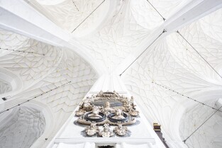 Gdańsk. Wnętrza Bazyliki Mariackiej Wniebowzięcia Najświętszej Maryi Panny w Gdańsku. Nz. Sklepienie nad nawami kościoła.